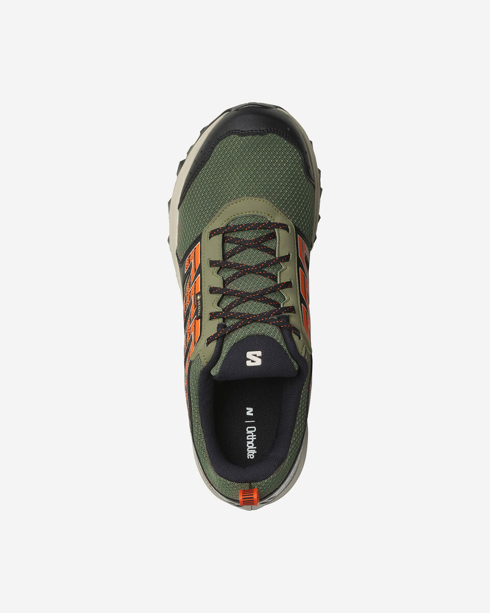 Scarpe da trail running Salomon dotata di tomaia in tessuto con membrana traspirante in GORE-TEX interamente impermeabile, equilibrio perfetto tra comfort e protezione. Suola in gomma resistente all'abrasione, antiscivolo. Colore: Deep Lichen Green/Rainy Day/Scarlet Ibis.